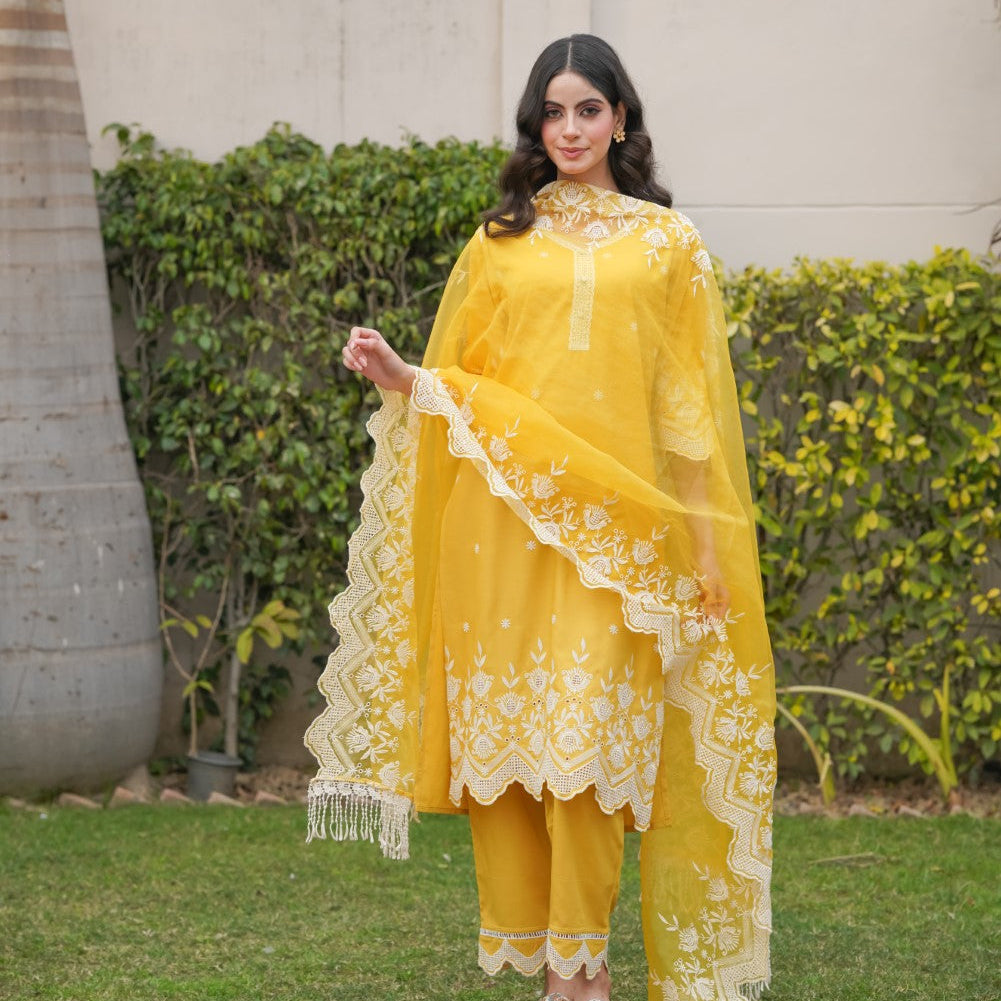 Mustard Yellow Triangle Cut-Work Suit-Set