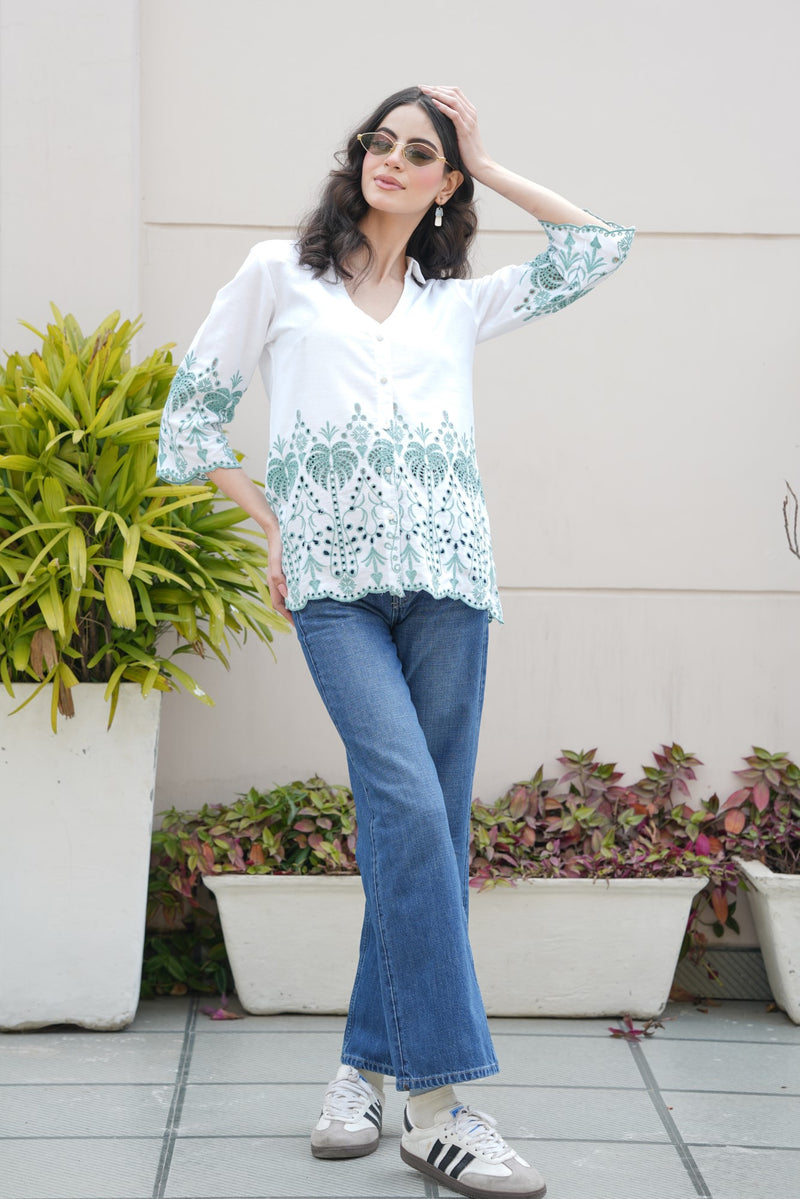 White with Cyan Green Cut-Work Top
