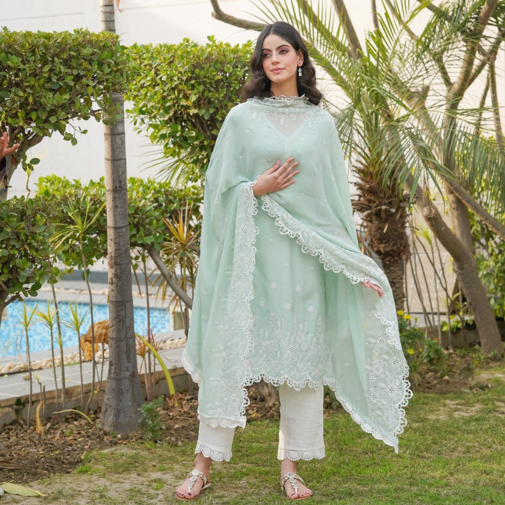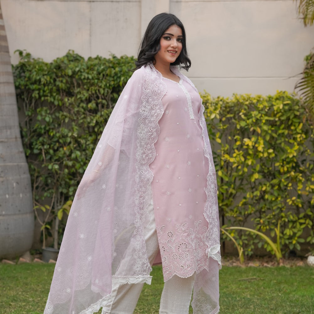 Indulge in the sheer beauty of this pastel suit-set, adorned with intricate cut-work kadhaee. The combination of soft colors and flowy fabric makes it a perfect fit throughout summer, spring and fall season.