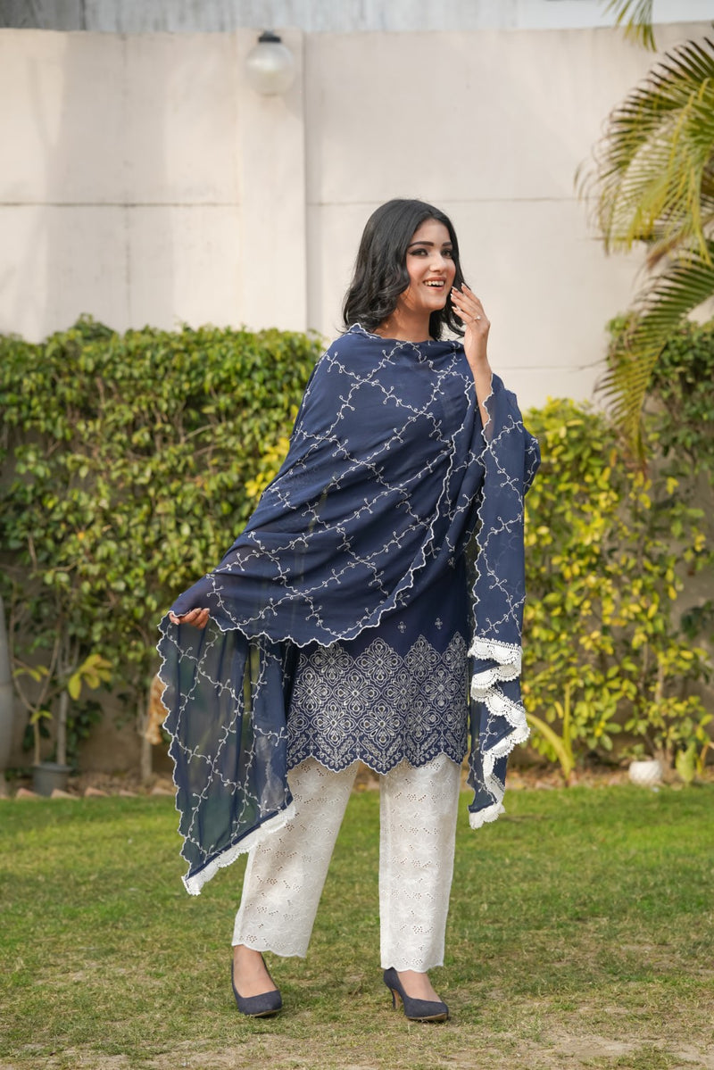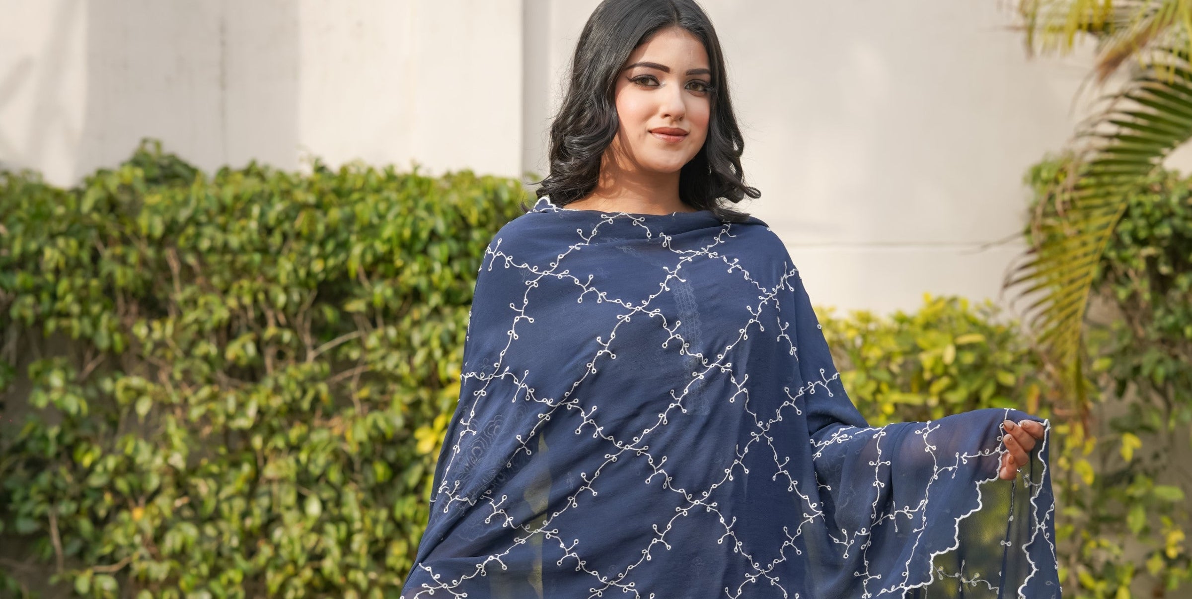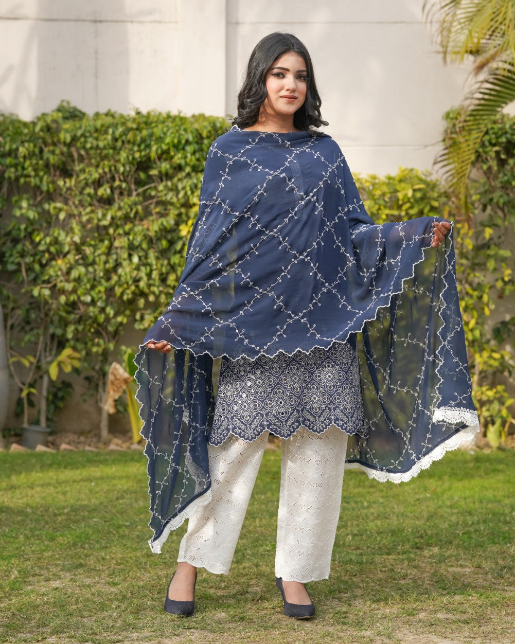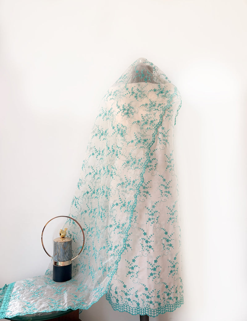 | Color | Powder blue dupatta with white cut-work kadhaee |