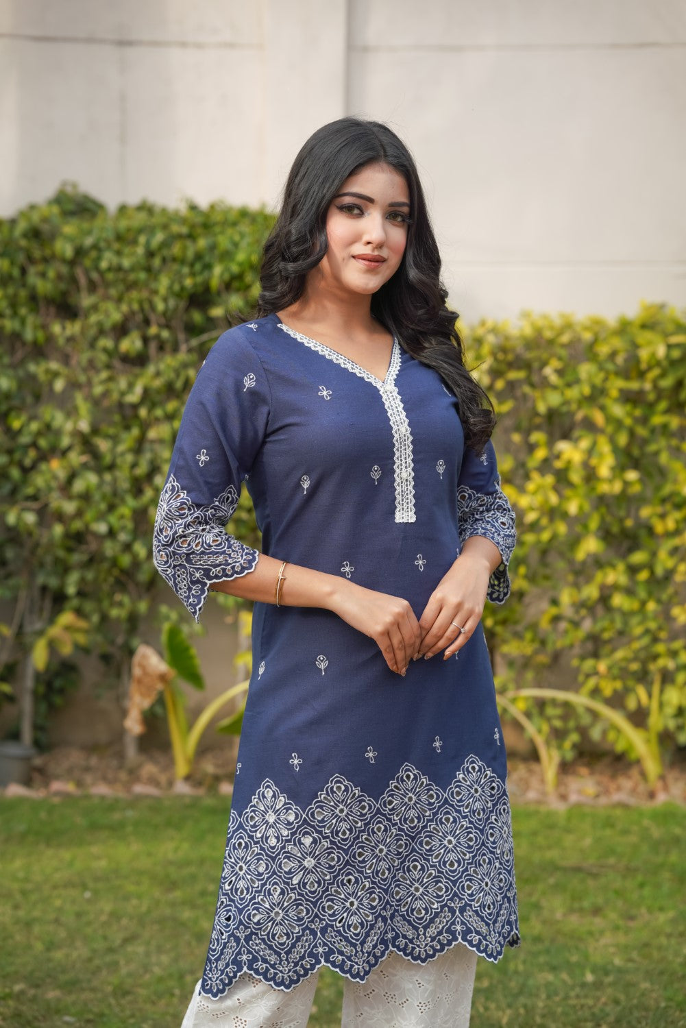 | Color | Midnight blue with white cut-work embroidery |
