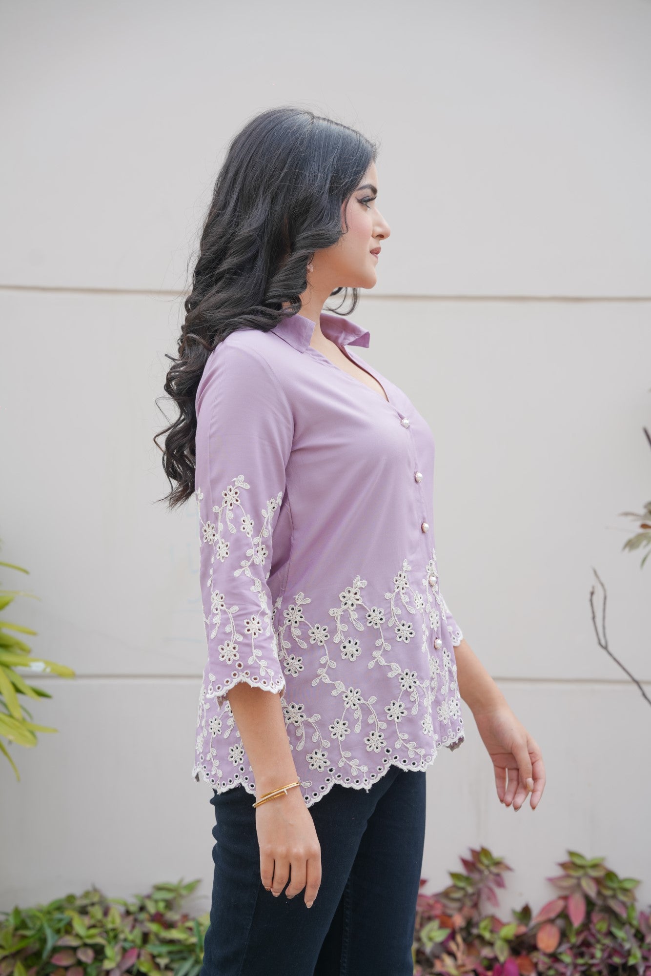 | Color | Mauve with white cording cut-work embroidery |