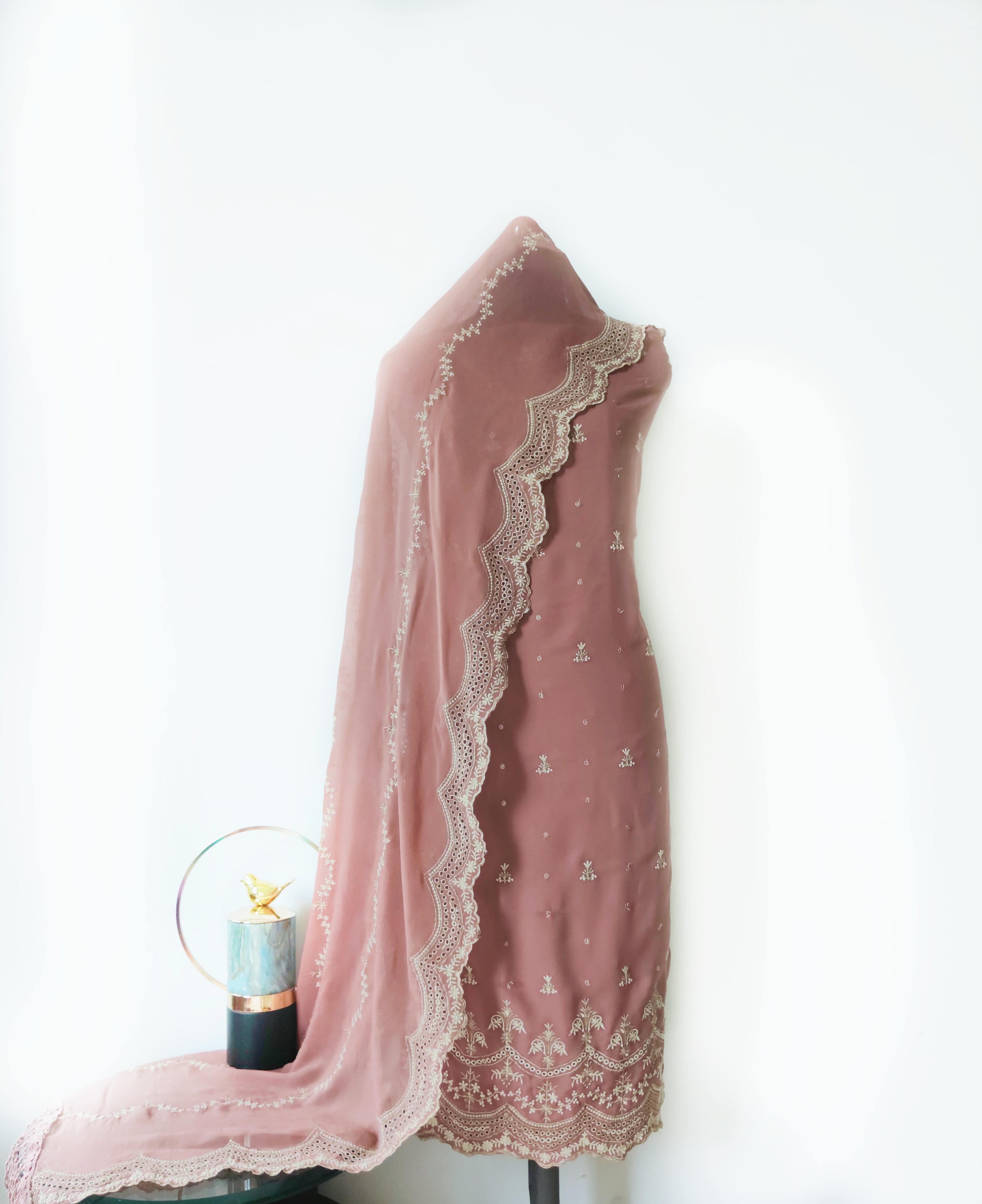 Rust Pink Zari Cut-Work Georgette Suit-Set