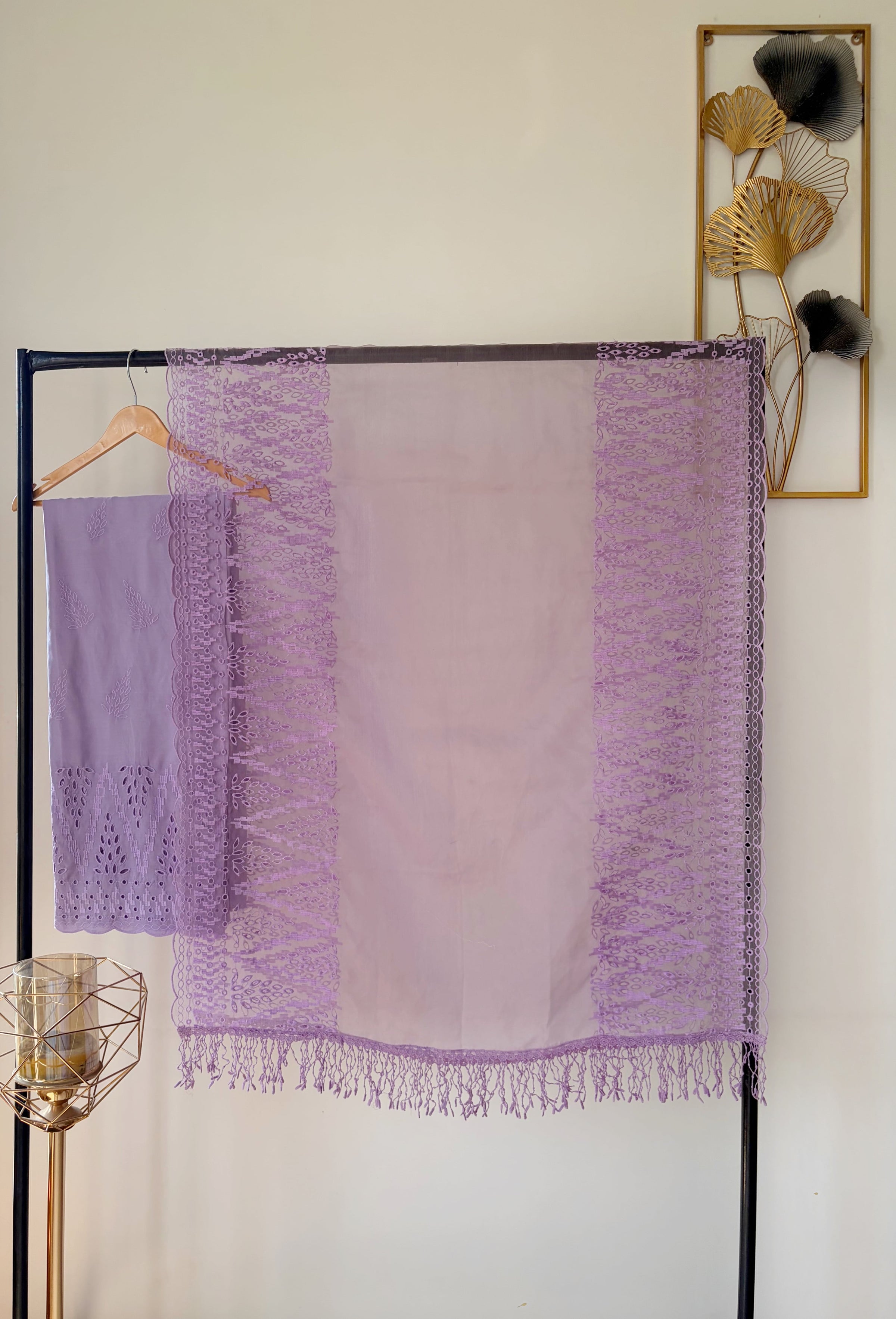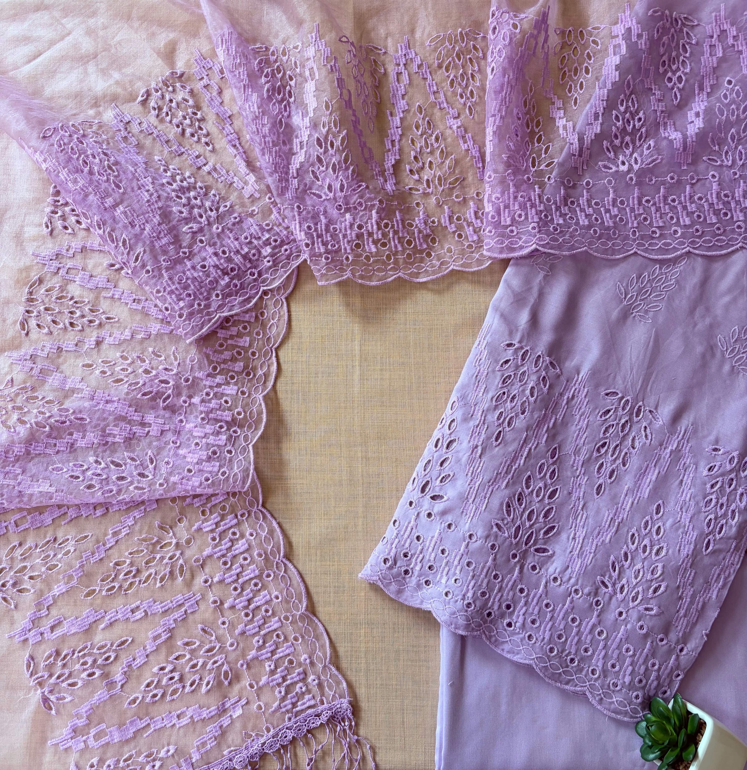 Indulge in the sheer beauty of this pastel suit-set, adorned with intricate cut-work kadhaee. The combination of pastel colors and flowy fabric makes it a perfect fit throughout summer, spring and fall season.